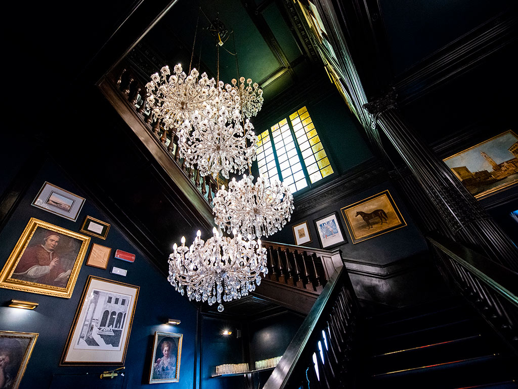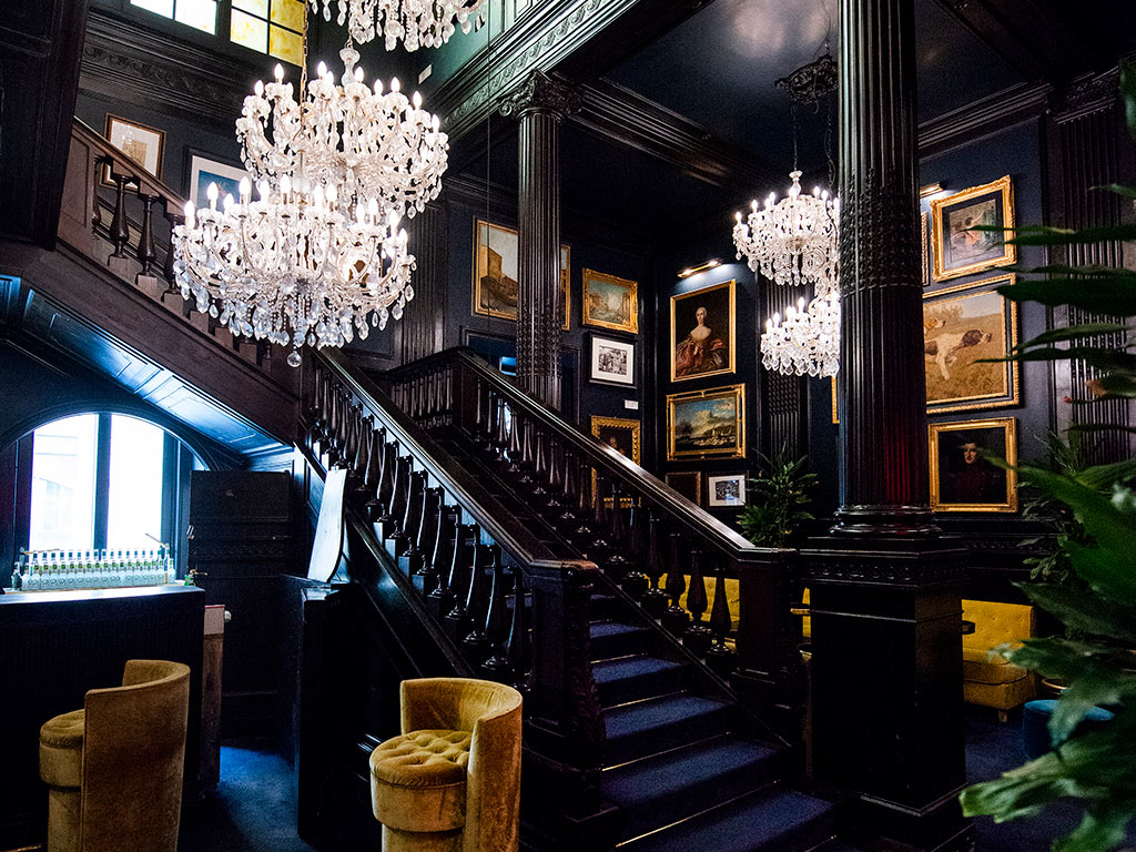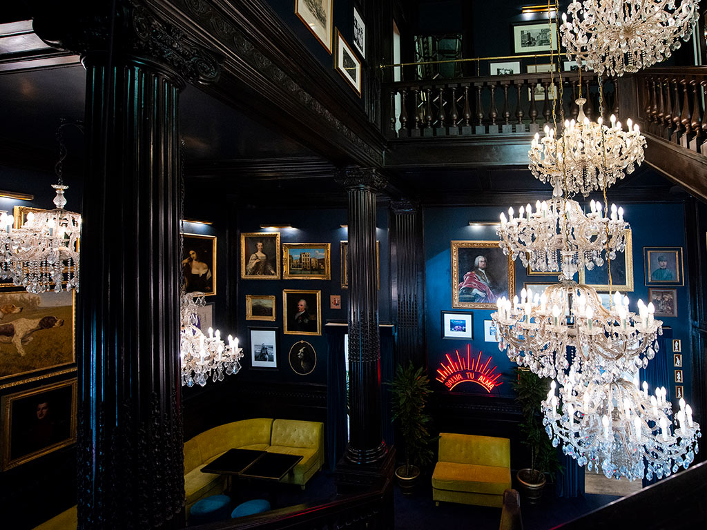 pisco bar The Pisco Bar welcomes visitors into a deep blue alcove and is illuminated by crystal chandeliers sourced from New York’s iconic Plaza Hotel, along with vintage Venini glass fixtures. A stately original wooden staircase sits proudly at the palazzo’s center, while grand archways link the lounge areas where turn-of-the-century beveled glass mirrors and intricate moldings embellish the light-filled spaces.