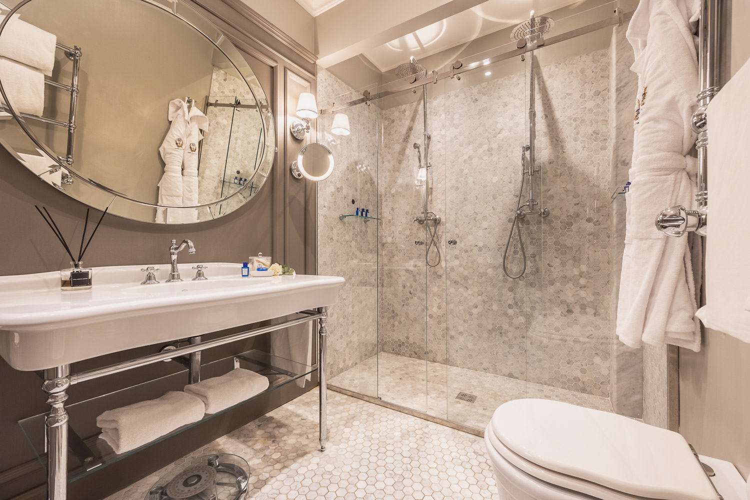 Each 269-square-foot room has a queen bed, views of the hotel entrance or Tiber River, soundproof walls, free Wi-Fi, a flat-screen TV with Sky and satellite channels, an elegant bathroom with a shower, wooden floors, individually controlled air conditioning, an electronic safe, Acqua di Parma toiletries, a bathrobe, slippers and Nespresso Coffee machine. Two of these Deluxe rooms are connecting to accommodate a family or friends traveling together.
